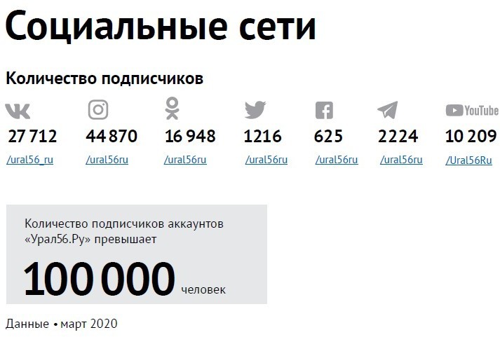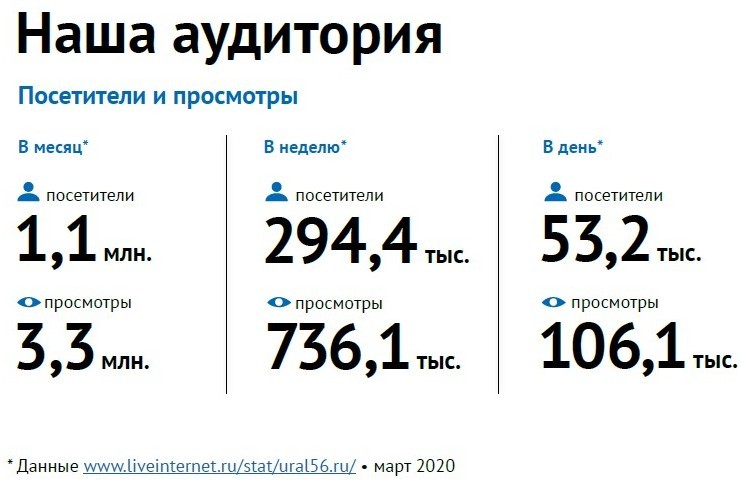 |    | |   | В марте 2020 года сайт Урал56.Ру преодолел отметку в миллион посетителей за месяц и стал на данный момент самым посещаемым онлайн-ресурсом Оренбургской области.